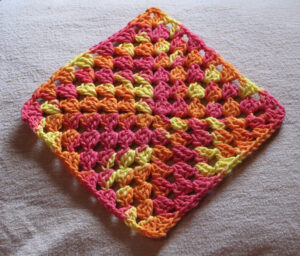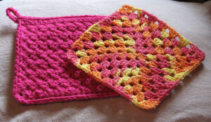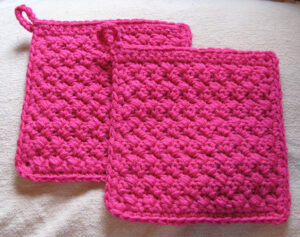 I made these potholders and this dishcloth for a friend of mine, her favorite color was hot pink. The dishcloth was just a basic granny square, and the potholders were made using two strands of yarn. I finished them in October 2007.